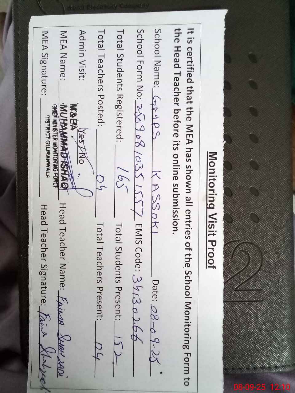 | Attendance Register | Head Teacher | MEA with School | Visit Proof |
