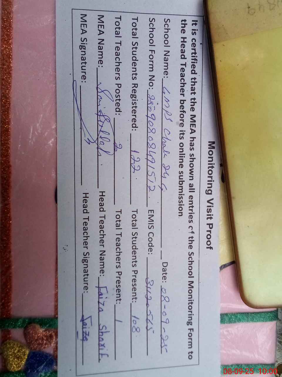 | Attendance Register | Head Teacher | MEA with School | Visit Proof |