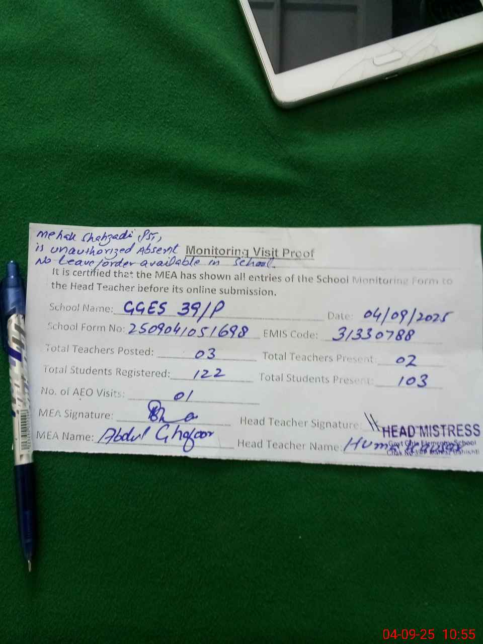 | Attendance Register | Head Teacher | MEA with School | Visit Proof |