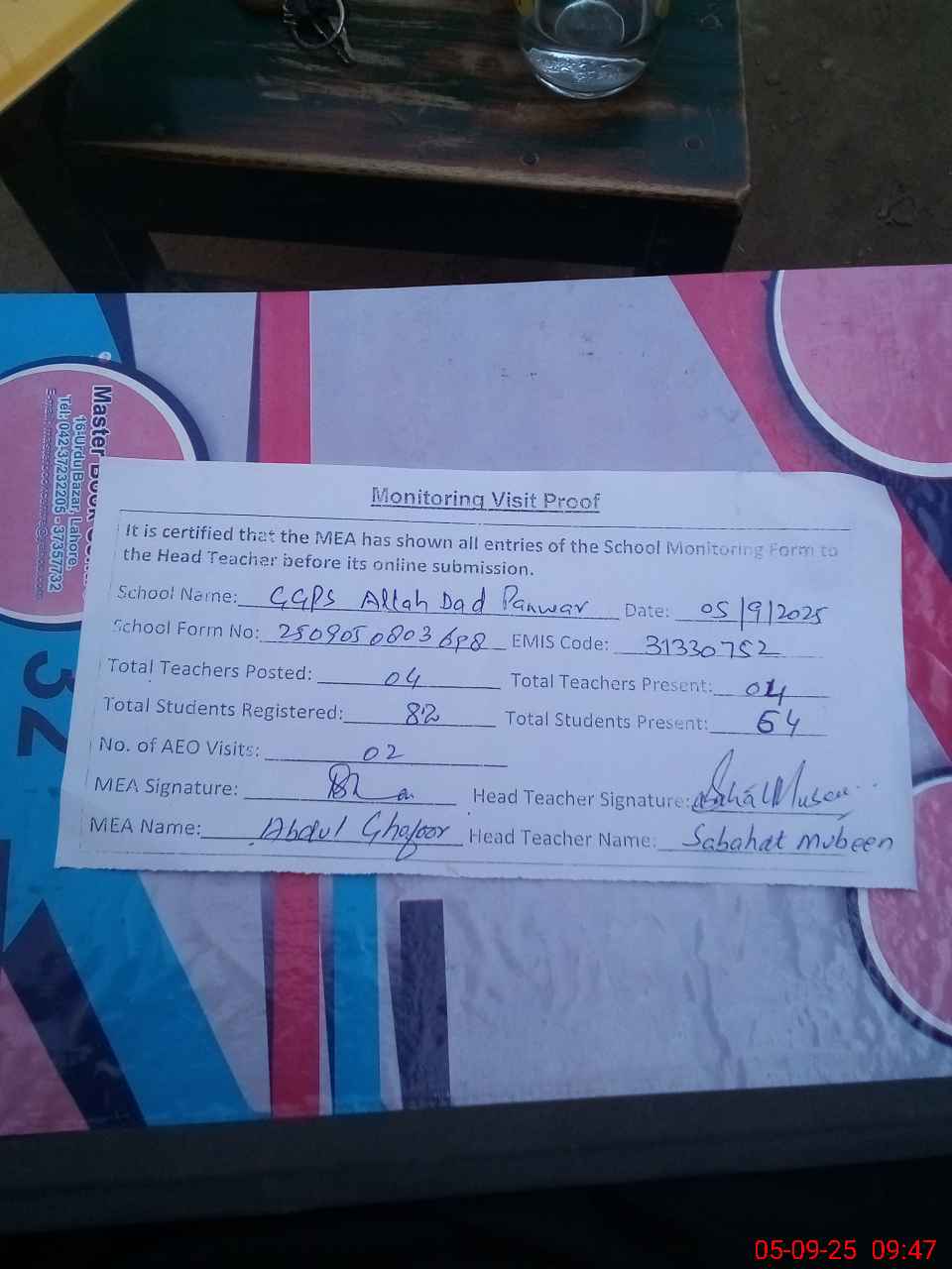 | Attendance Register | Head Teacher | MEA with School | Visit Proof |