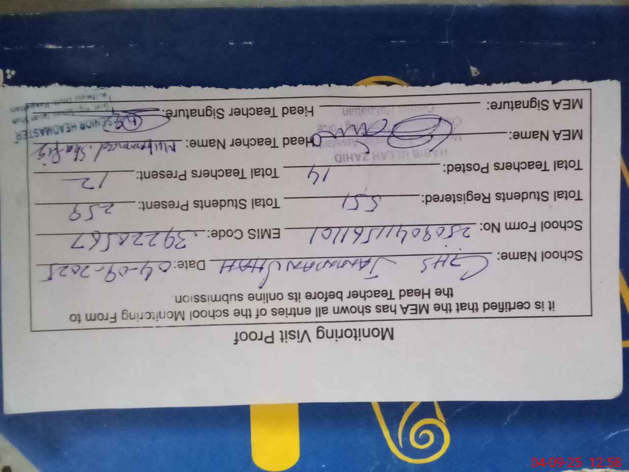 | EMIS Code: 39220567 | Name of School: GHS JUMAN SHAH | |||