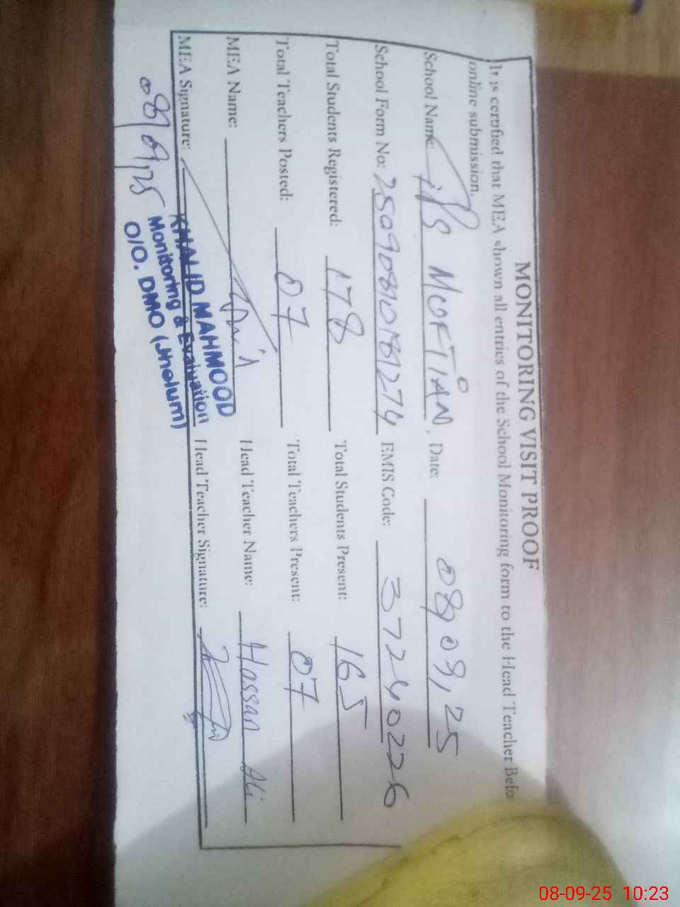 | Certified that this School was Inspected by the Undersigned MEA/DMO Today and the Information Stated Above is as Per Record. | |||||
