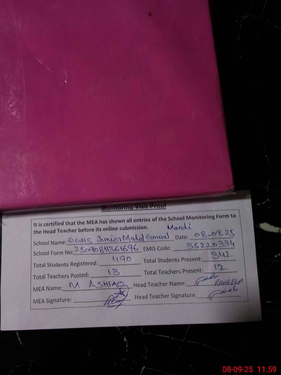| Attendance Register | Head Teacher | MEA with School | Visit Proof |