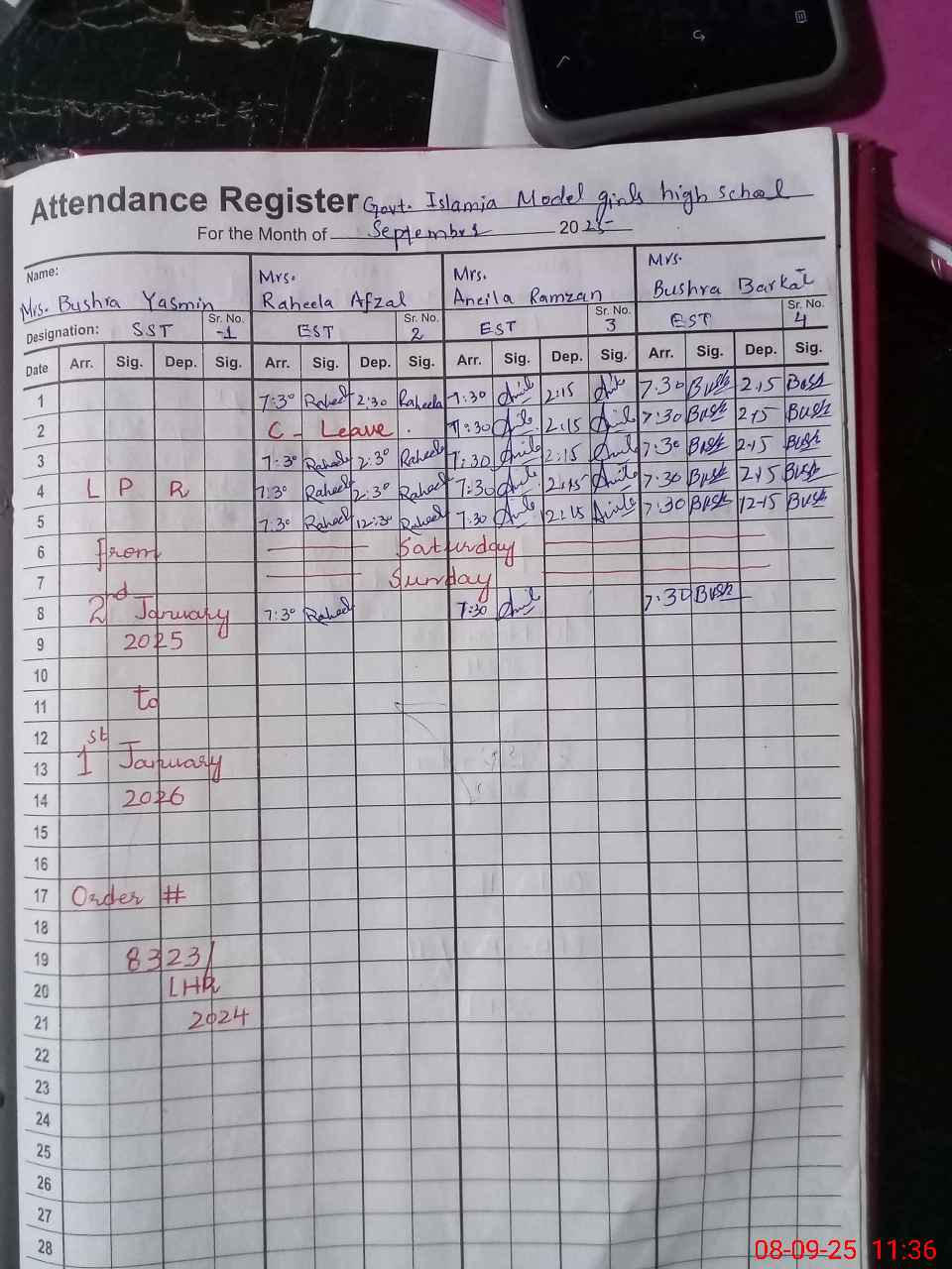 | Remarks (Use Separate Page if Required): PST Sunmya Noor on extra ordinary leave from 19 August 25 to 14 November 25 Paint work required at several points NSB register not updated for the month of August 2025 35220334 | |||||
