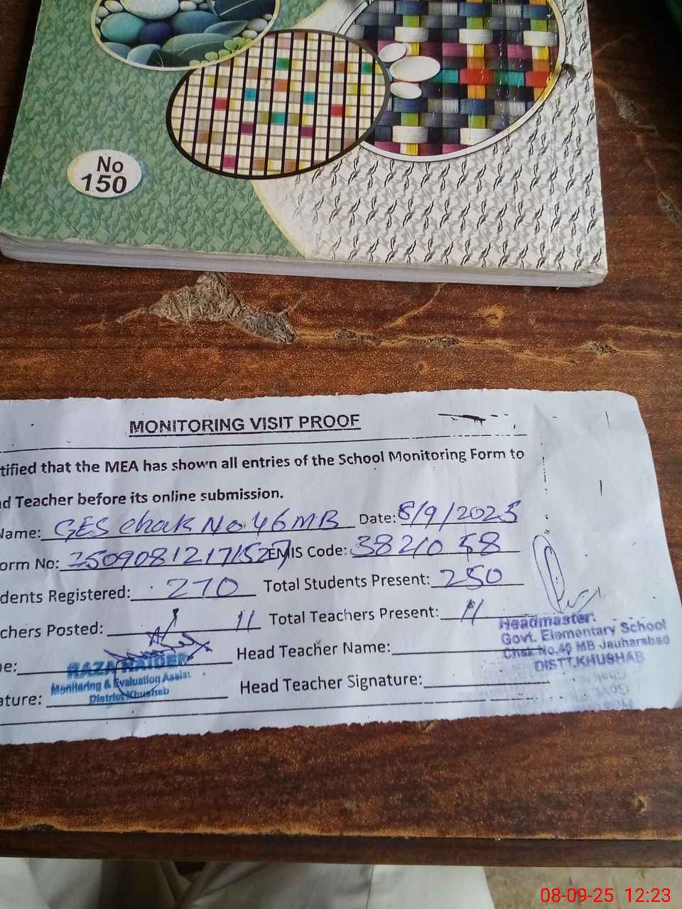 | Attendance Register | Head Teacher | MEA with School | Visit Proof |