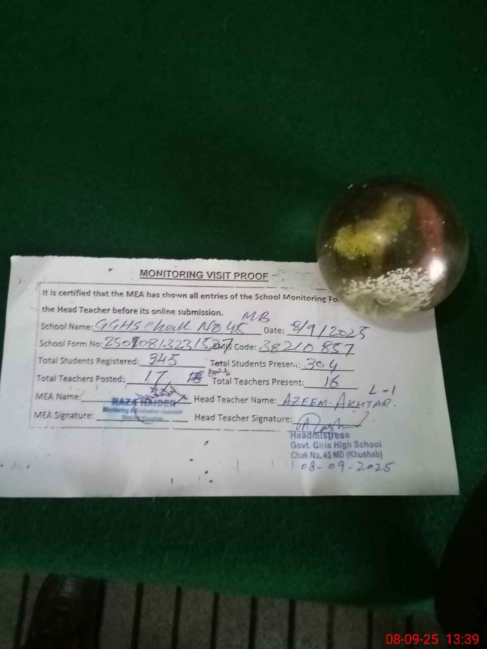 | EMIS Code: 38210857 | Name of School: GGHS CHAK NO 45 MB | |||