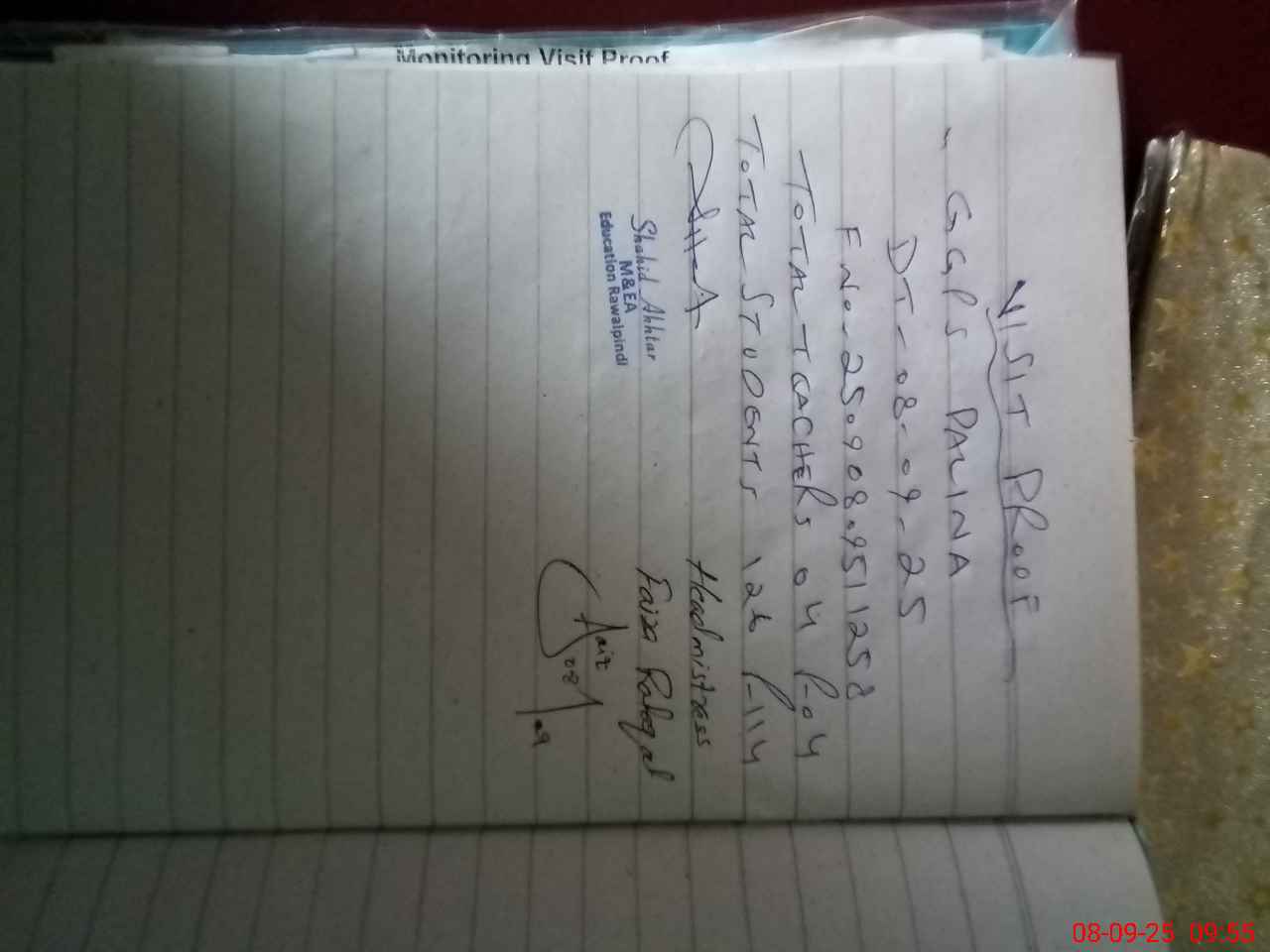 | Attendance Register | Head Teacher | MEA with School | Visit Proof |