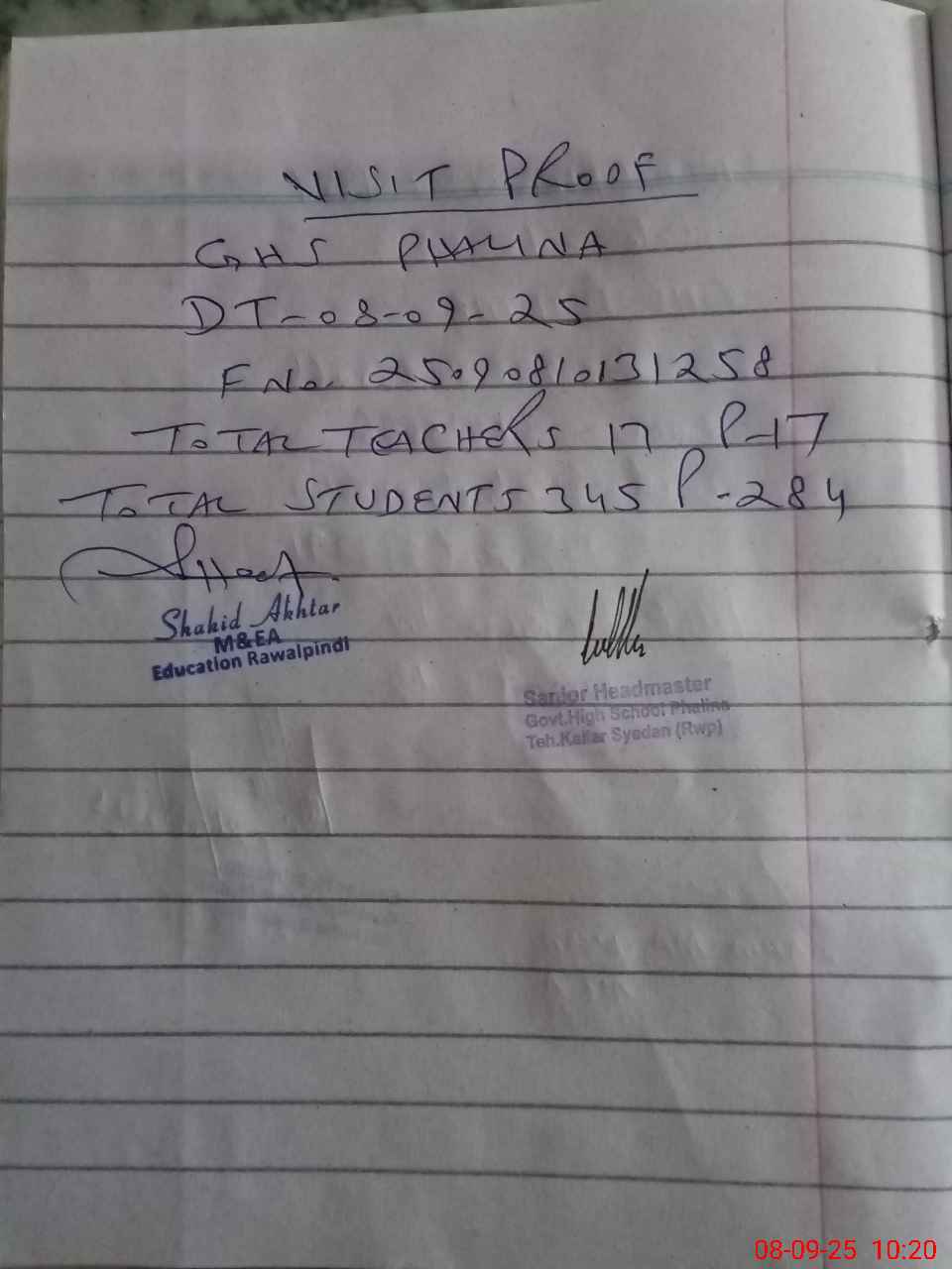 | Attendance Register | Head Teacher | MEA with School | Visit Proof |