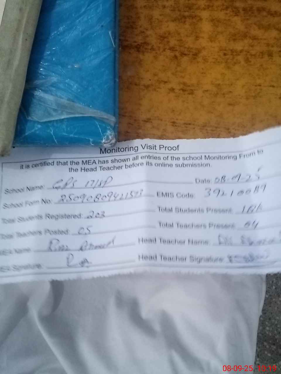 | Attendance Register | Head Teacher | MEA with School | Visit Proof |