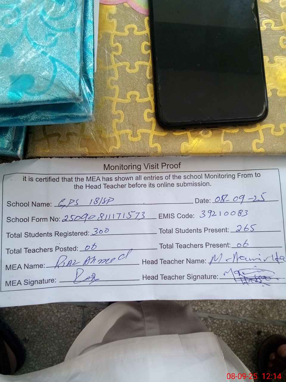 | Attendance Register | Head Teacher | MEA with School | Visit Proof |