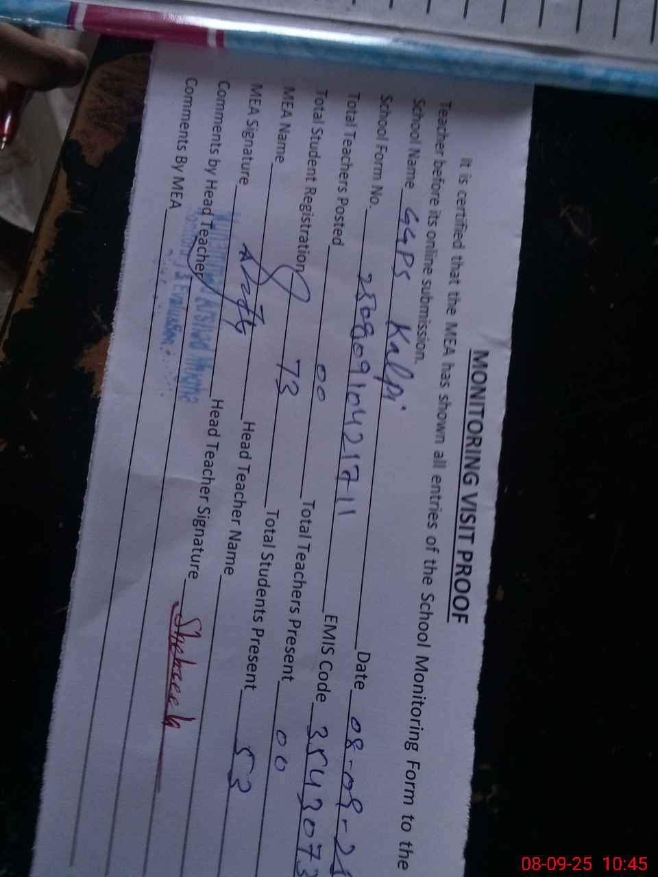 | Attendance Register | Head Teacher | MEA with School | Visit Proof |