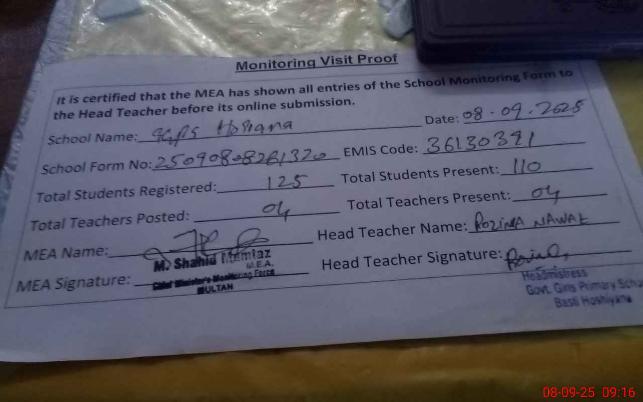 | Monitoring Date: 08-09-2025 | Start Time: 08-09-2025 08:26 AM | End Time: 08-09-2025 09:17 AM | Name of MEA: MU**** SH**** MU**** | |