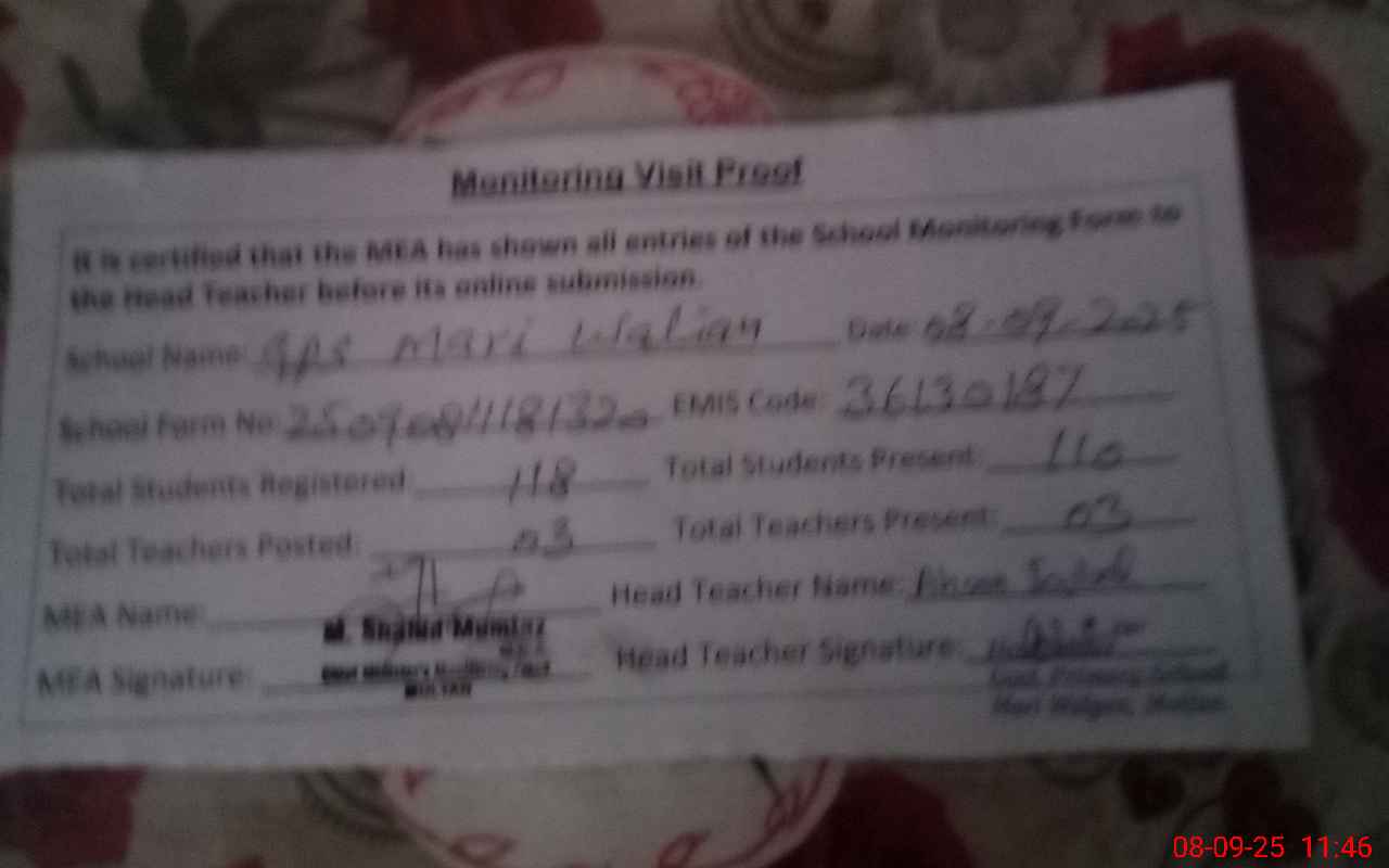 | EMIS Code: 36130187 | Name of School: GPS MARI WALIAN P/O SUNDA GHULAM HUSSAIN | |||