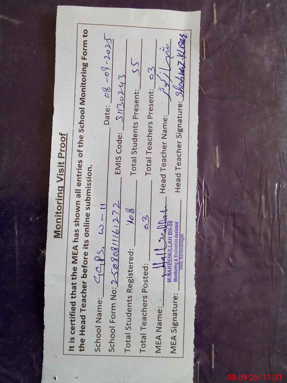 | Attendance Register | Head Teacher | MEA with School | Visit Proof |