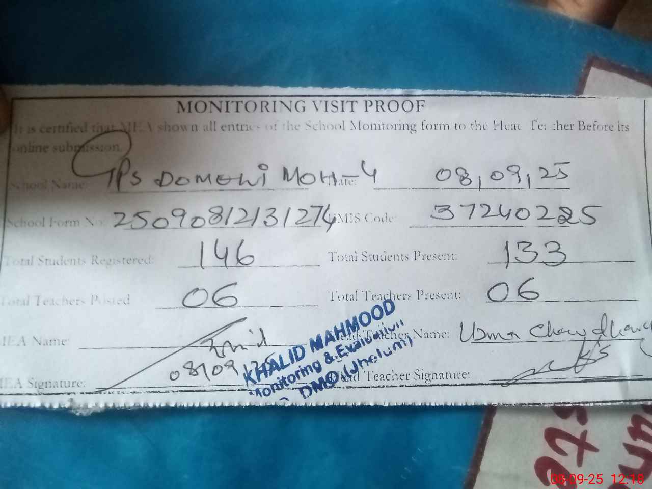 | Attendance Register | Head Teacher | MEA with School | Visit Proof |