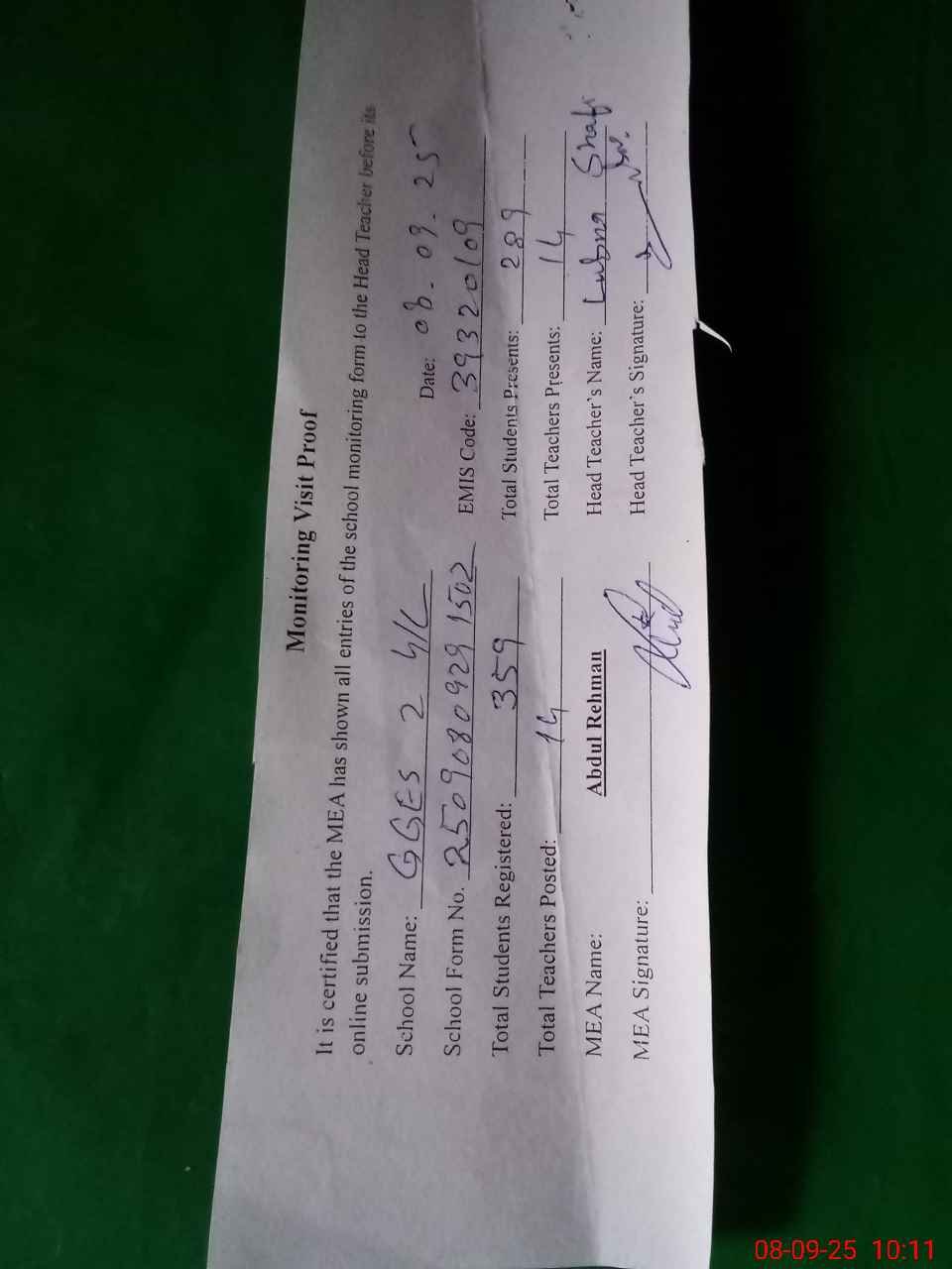 | Attendance Register | Head Teacher | MEA with School | Visit Proof |