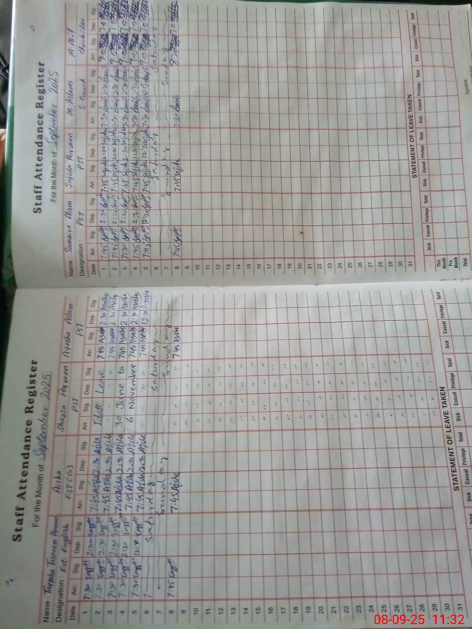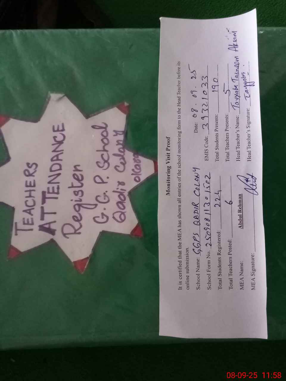 | Attendance Register | Head Teacher | MEA with School | Visit Proof |