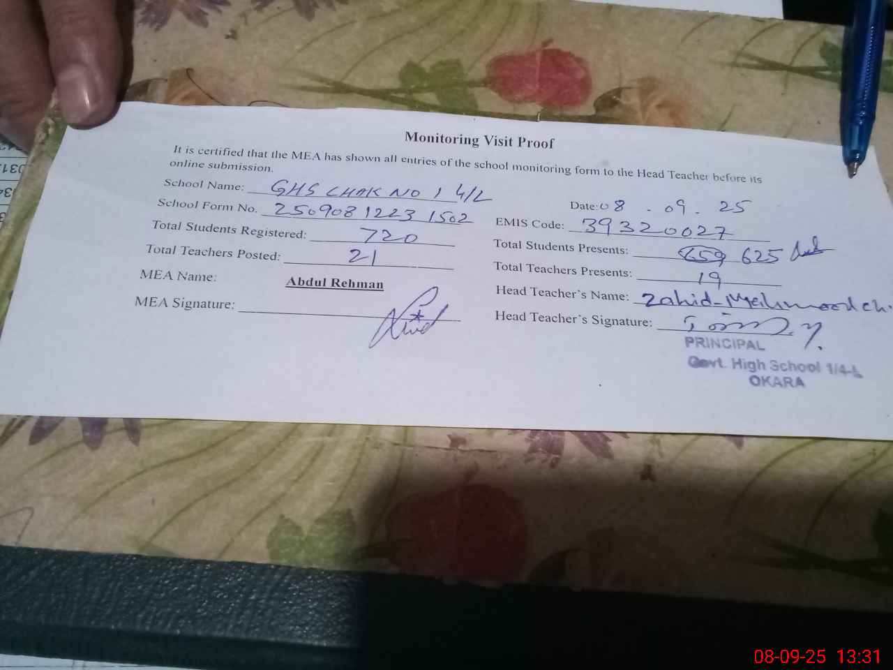 | Attendance Register | Head Teacher | MEA with School | Visit Proof |