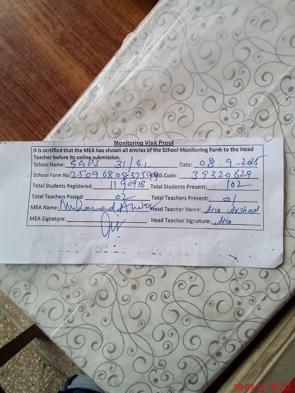 | Attendance Register | Head Teacher | MEA with School | Visit Proof |