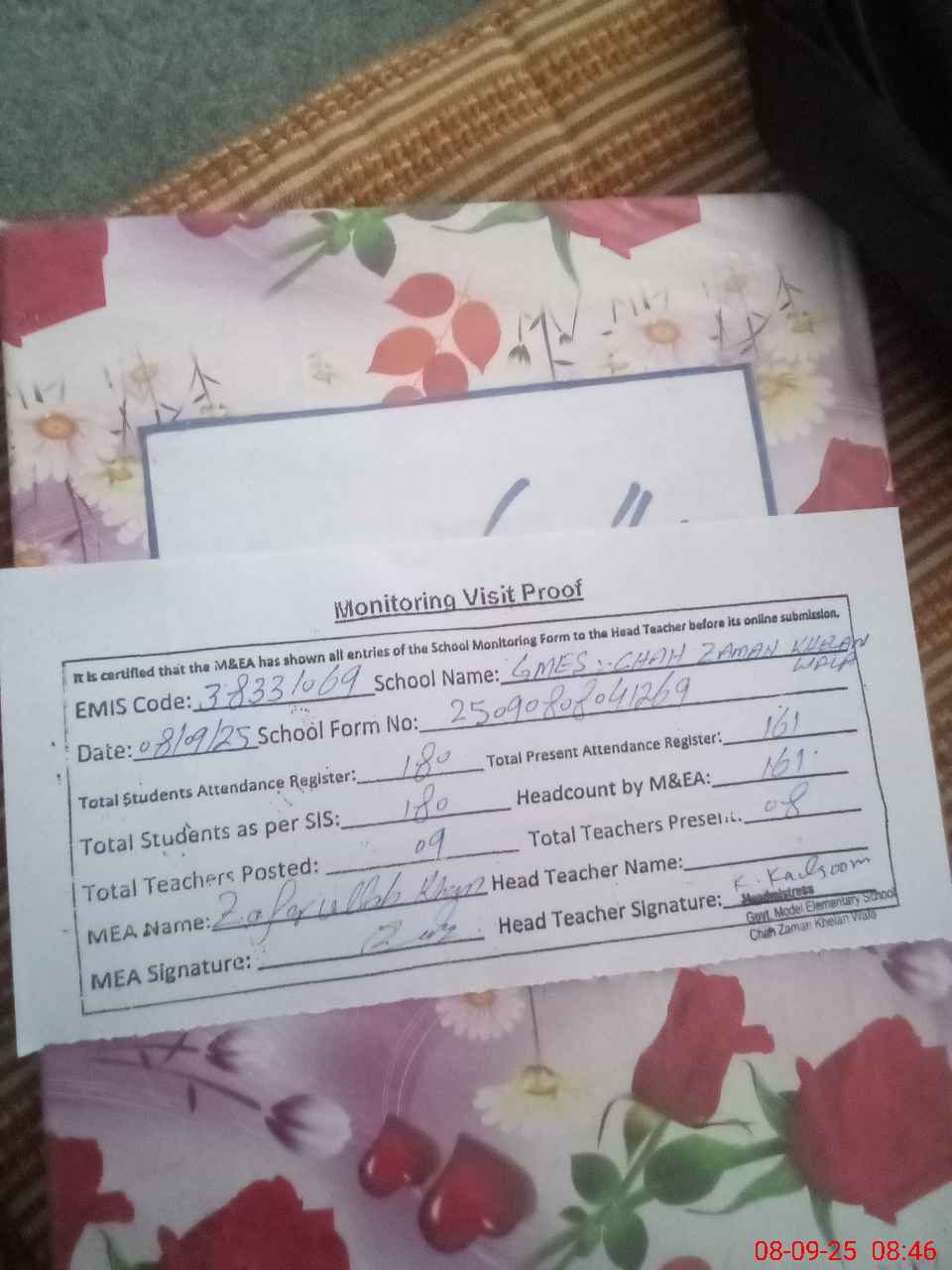 | Attendance Register | Head Teacher | MEA with School | Visit Proof |