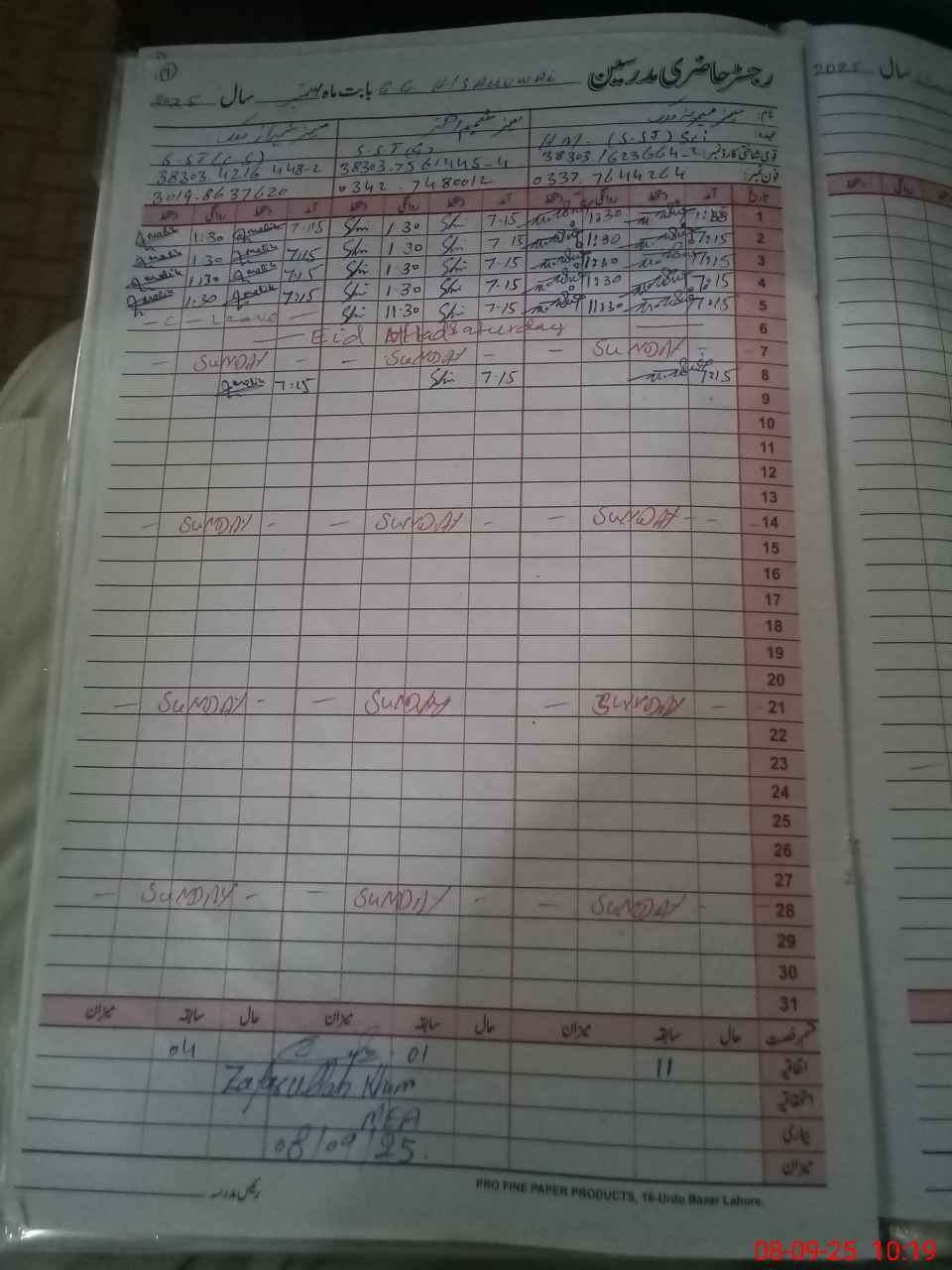 | CNIC | Full Name | Designation | R/C | Absence During Last Calender Month |