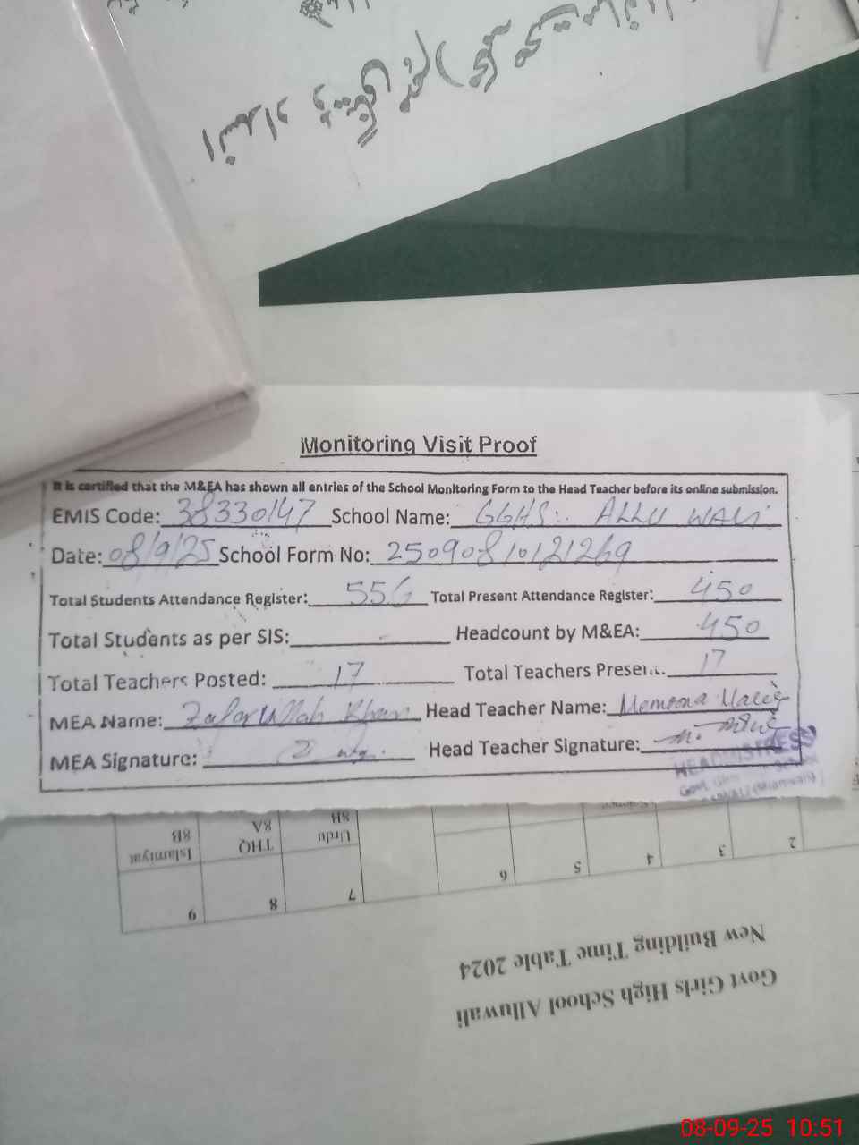 | Attendance Register | Head Teacher | MEA with School | Visit Proof |