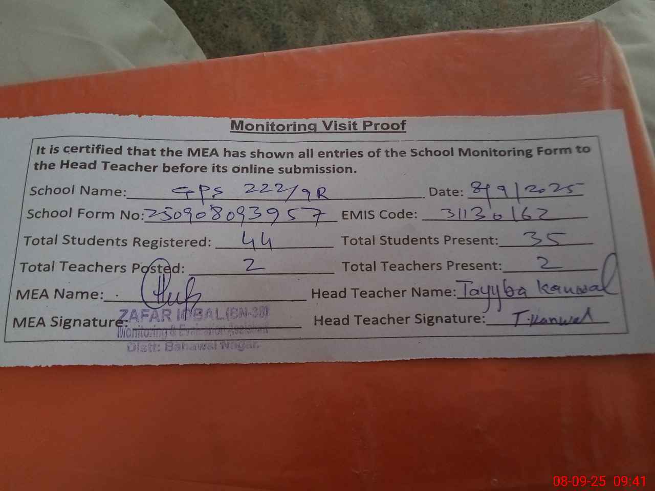 | Attendance Register | Head Teacher | MEA with School | Visit Proof |