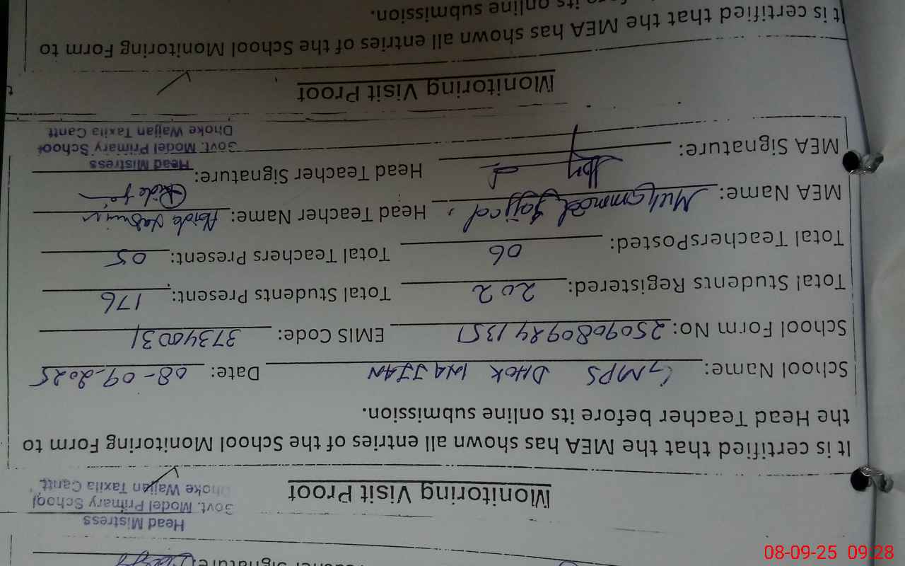 | Attendance Register | Head Teacher | MEA with School | Visit Proof |