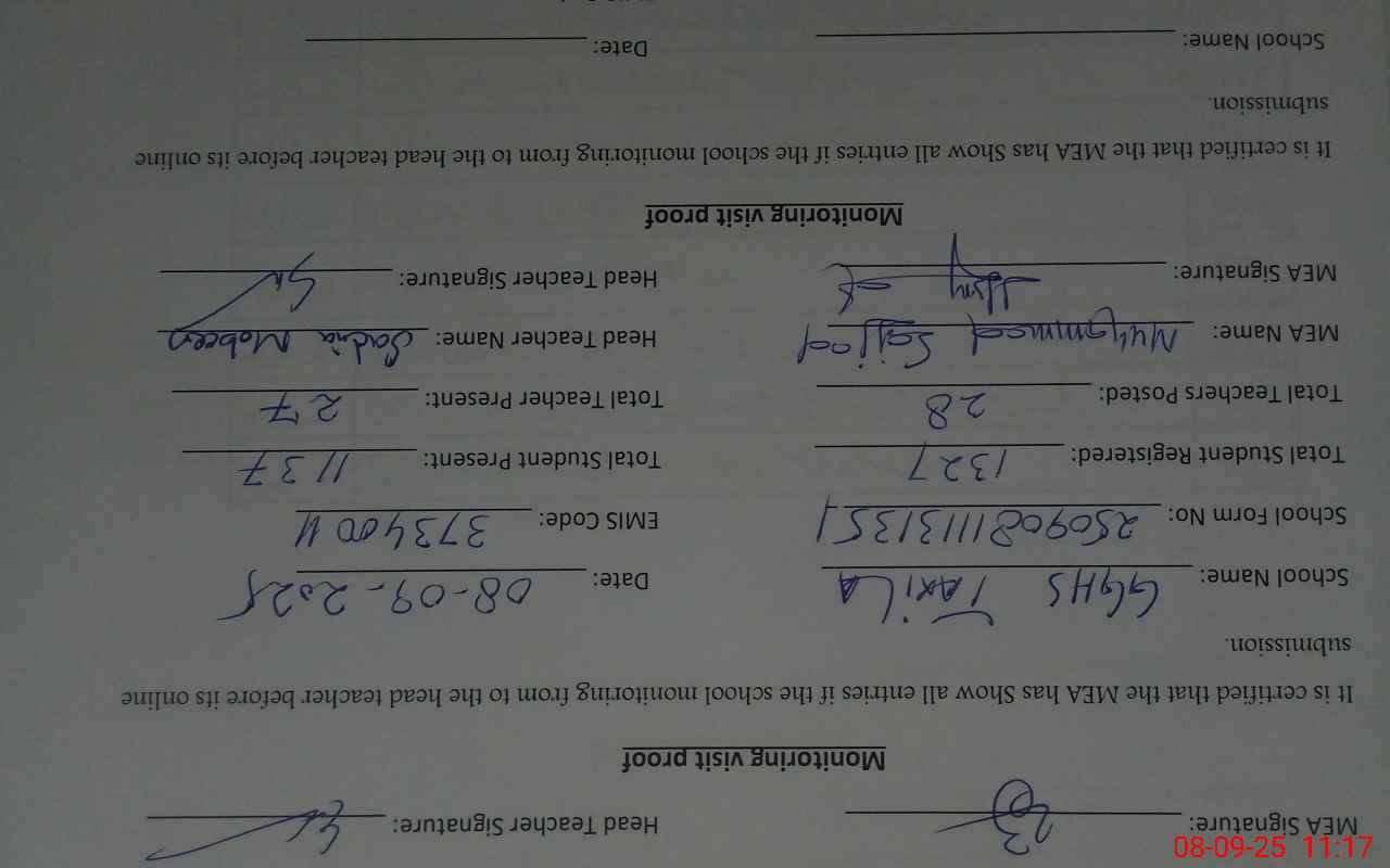 | Attendance Register | Head Teacher | MEA with School | Visit Proof |