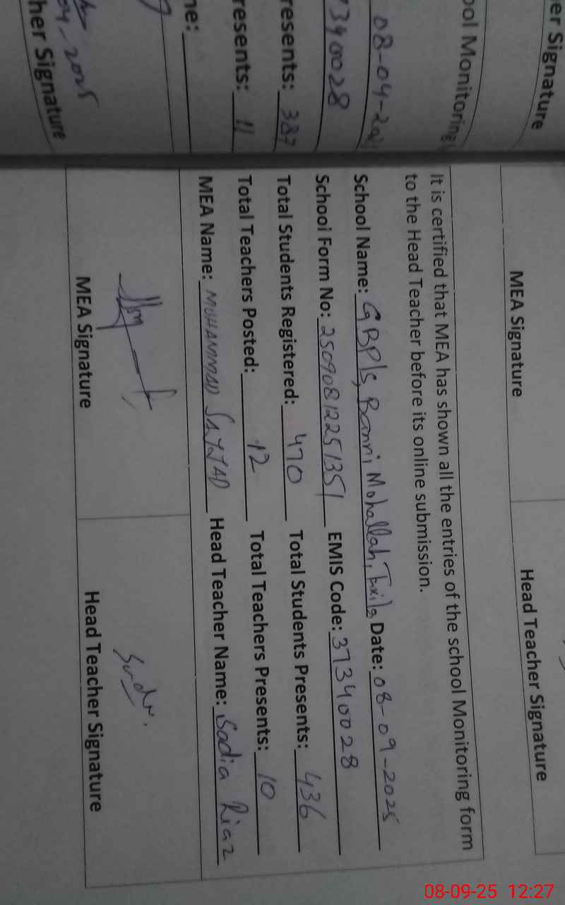| EMIS Code: 37340028 | Name of School: GPS BANNI MOHALLAH | |||