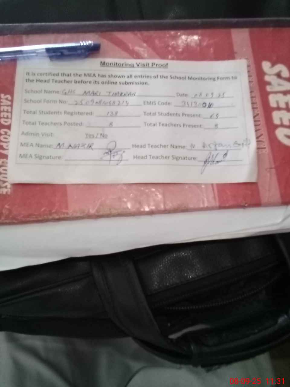| Attendance Register | Head Teacher | MEA with School | Visit Proof |