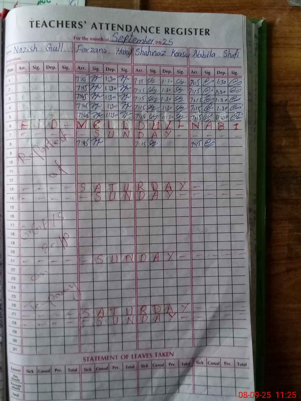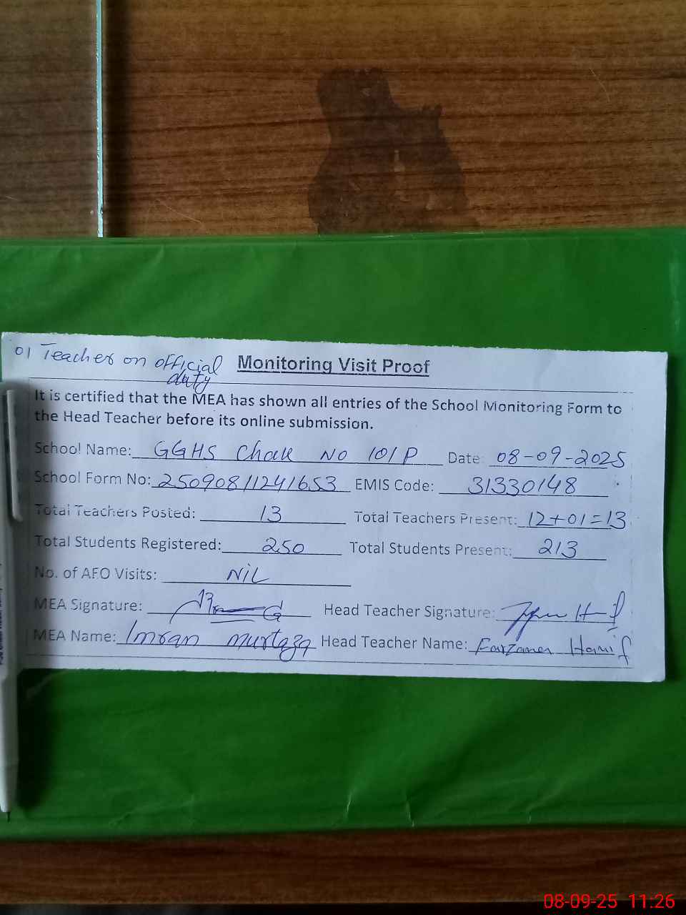 | Attendance Register | Head Teacher | MEA with School | Visit Proof |