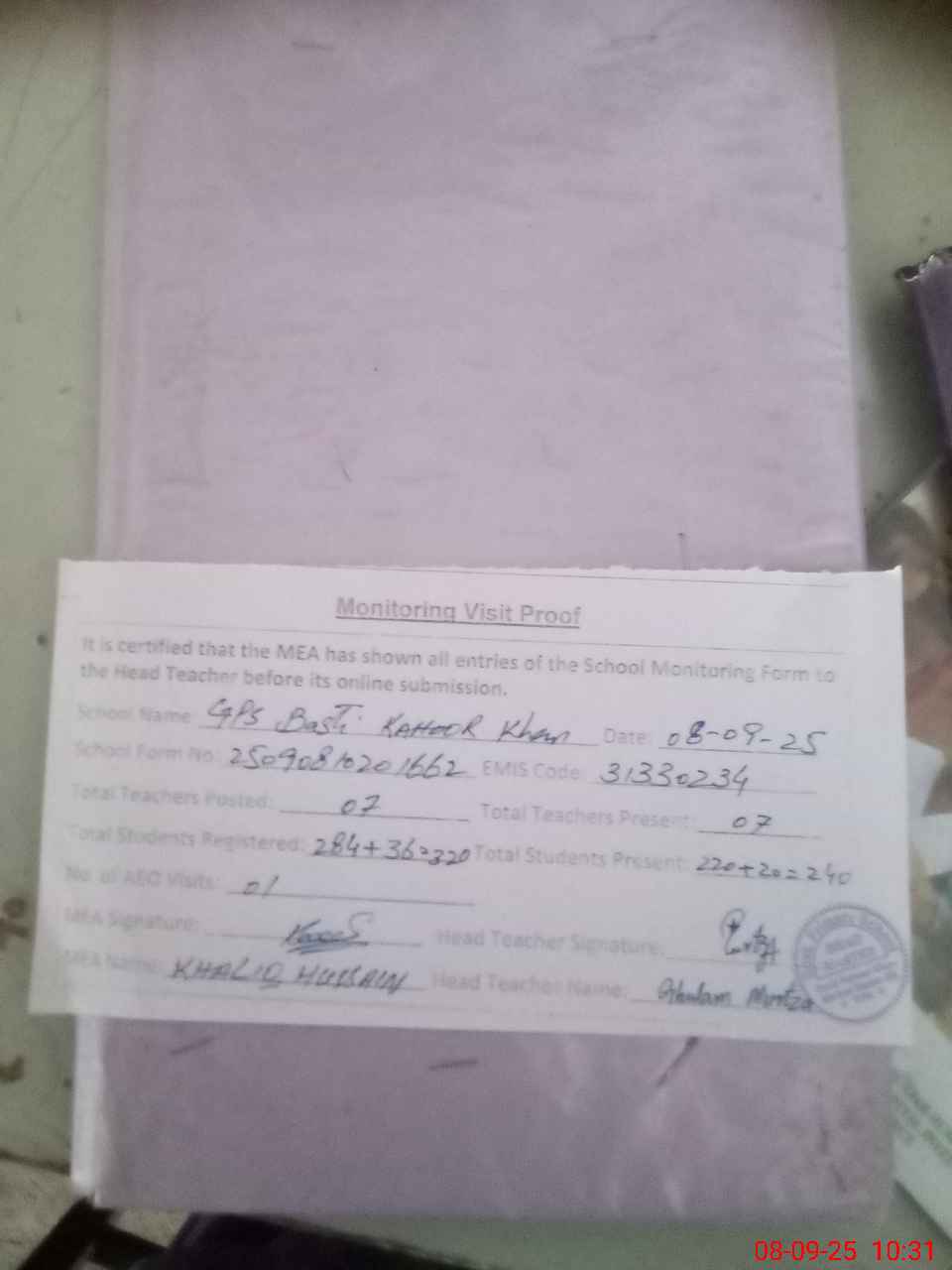 | Attendance Register | Head Teacher | MEA with School | Visit Proof |