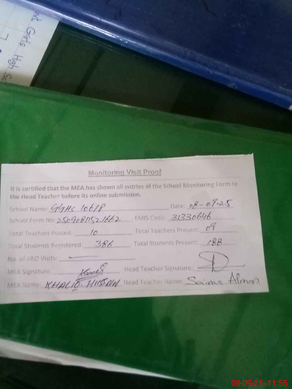 | Attendance Register | Head Teacher | MEA with School | Visit Proof |