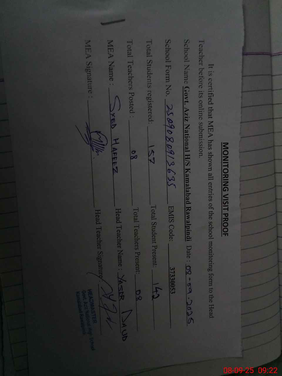 | Attendance Register | Head Teacher | MEA with School | Visit Proof |