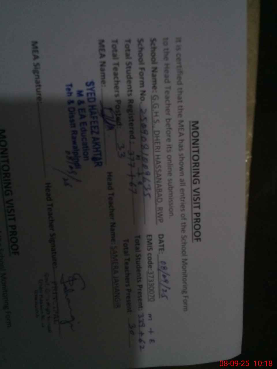 | Certified that this School was Inspected by the Undersigned MEA/DMO Today and the Information Stated Above is as Per Record. | |||||