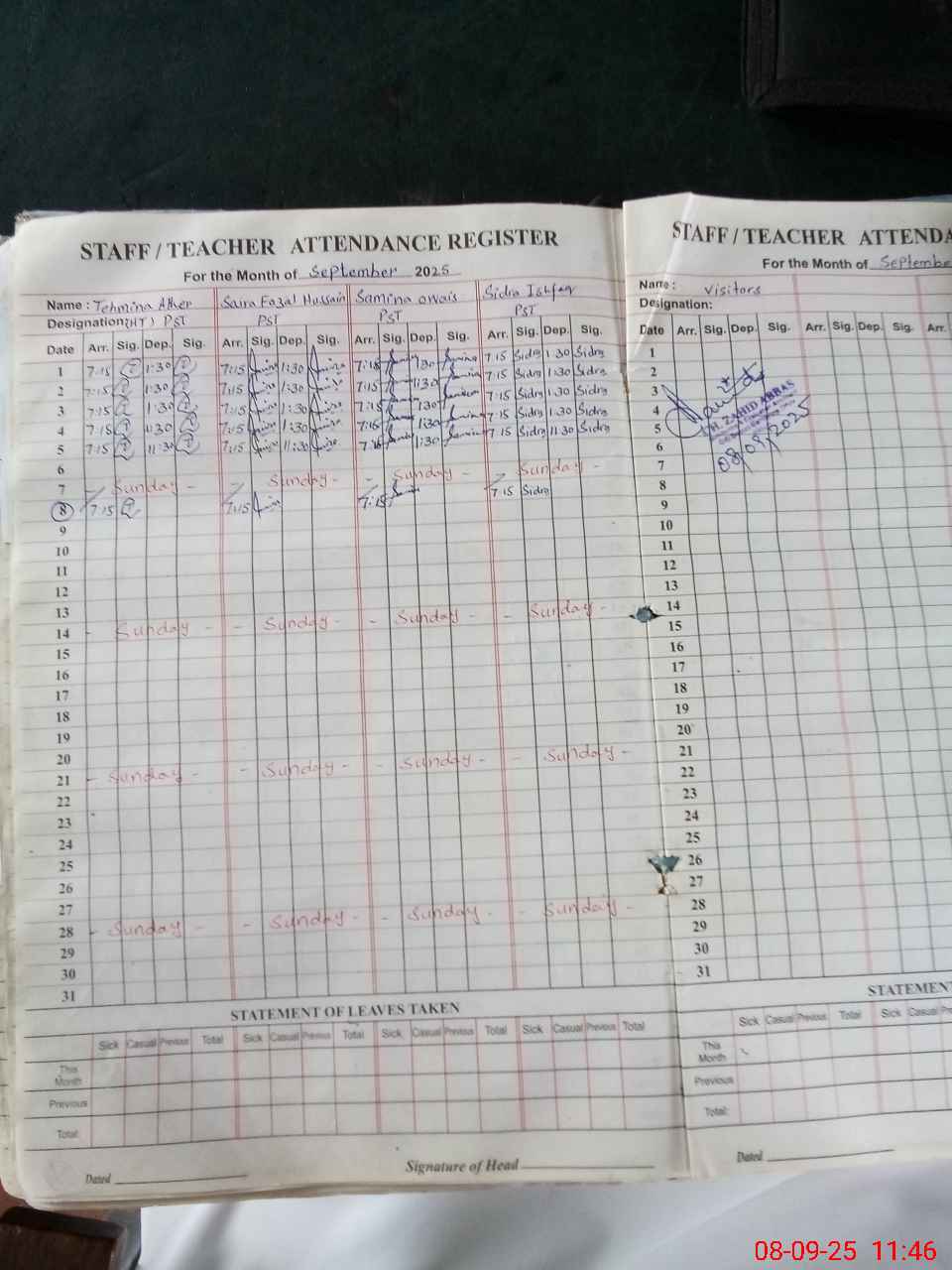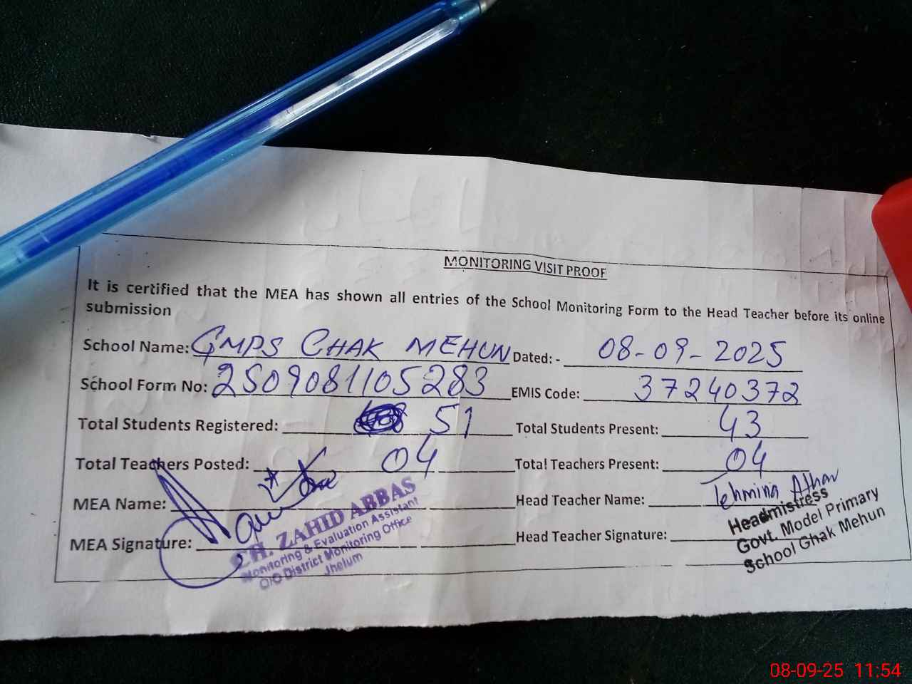 | Attendance Register | Head Teacher | MEA with School | Visit Proof |