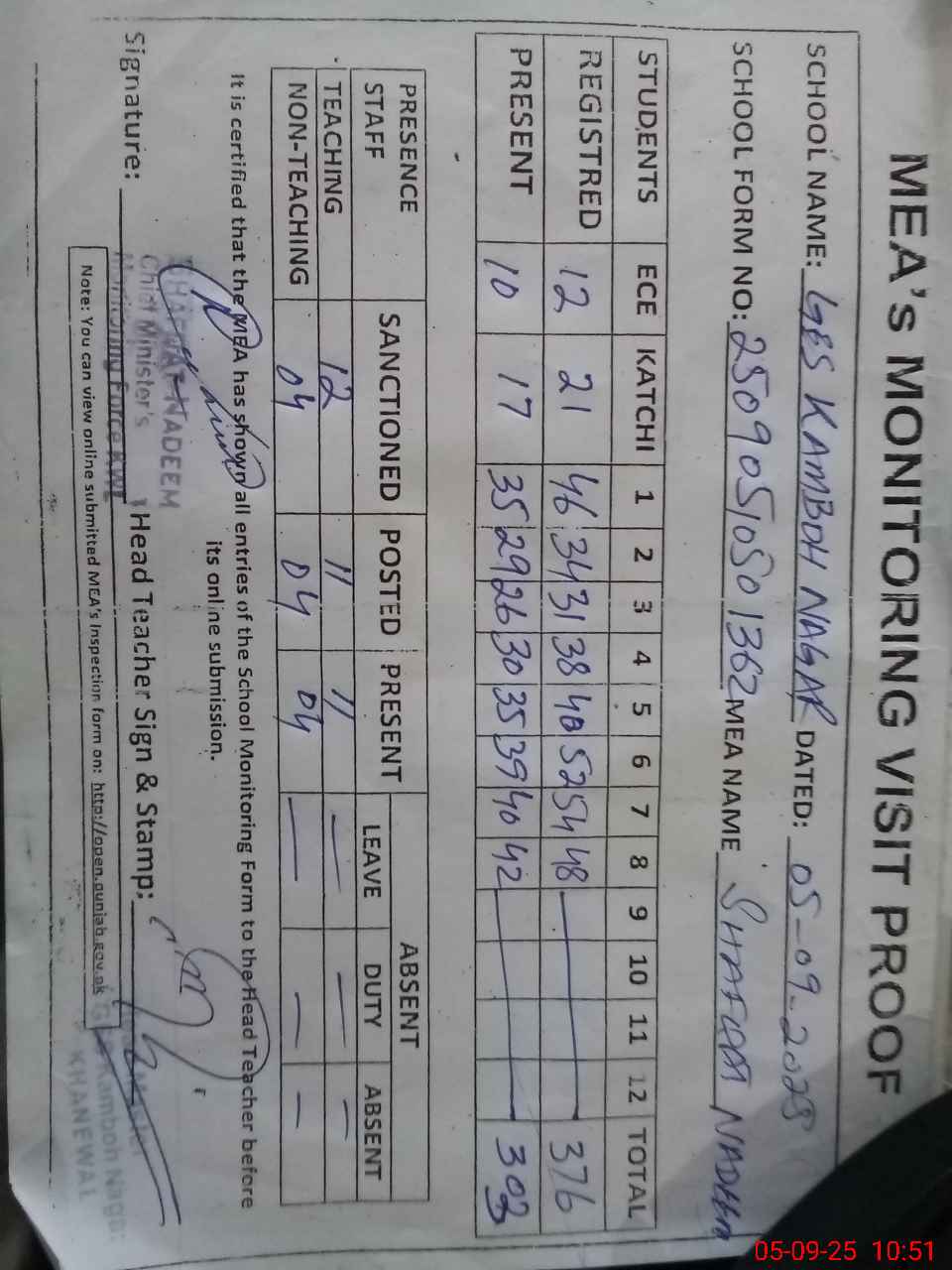 | Attendance Register | Head Teacher | MEA with School | Visit Proof |