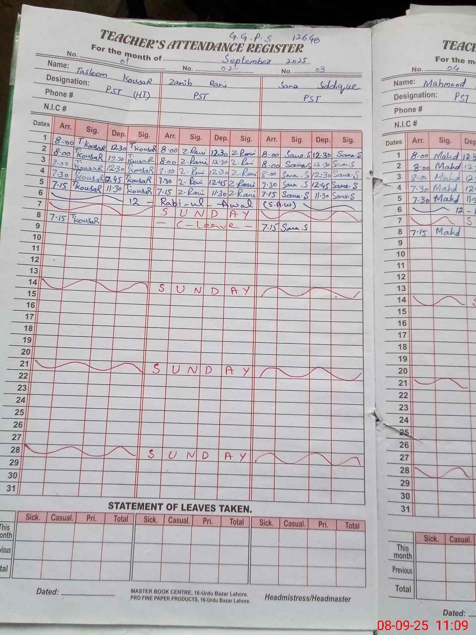 | CNIC | Full Name | Designation | R/C | Absence During Last Calender Month |