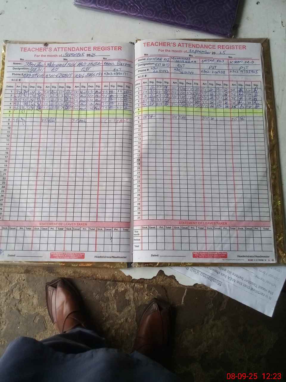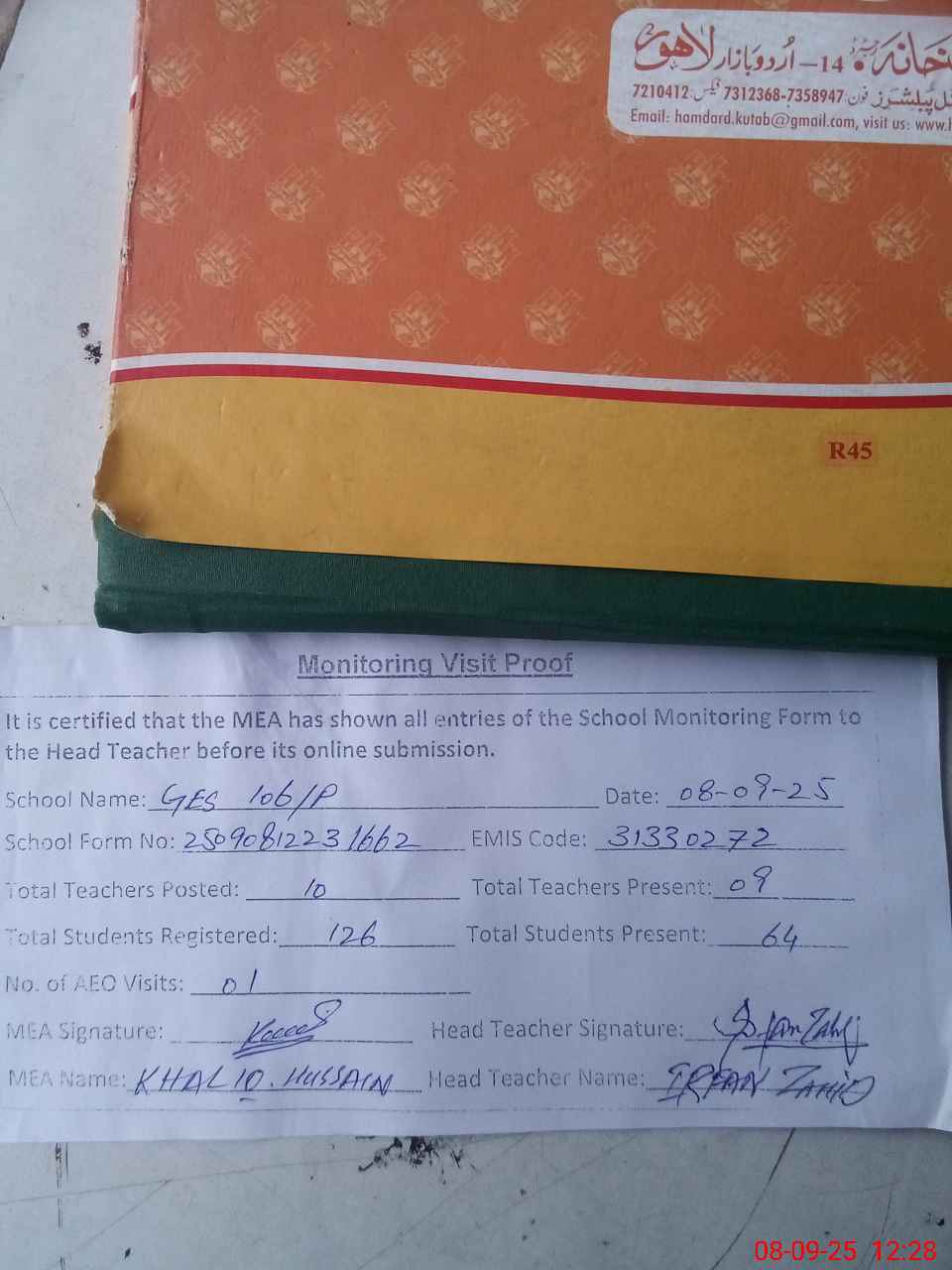 | Attendance Register | Head Teacher | MEA with School | Visit Proof |