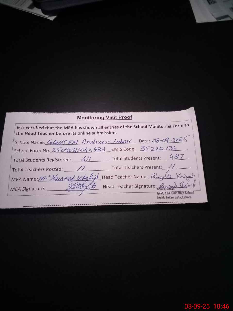 | Certified that this School was Inspected by the Undersigned MEA/DMO Today and the Information Stated Above is as Per Record. | |||||