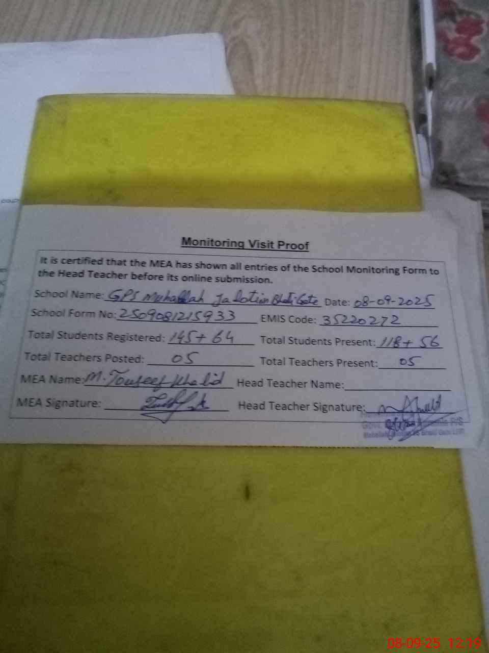 | EMIS Code: 35220272 | Name of School: GPS MUHALLAH JALOTION BHATI GATE LAHORE | |||