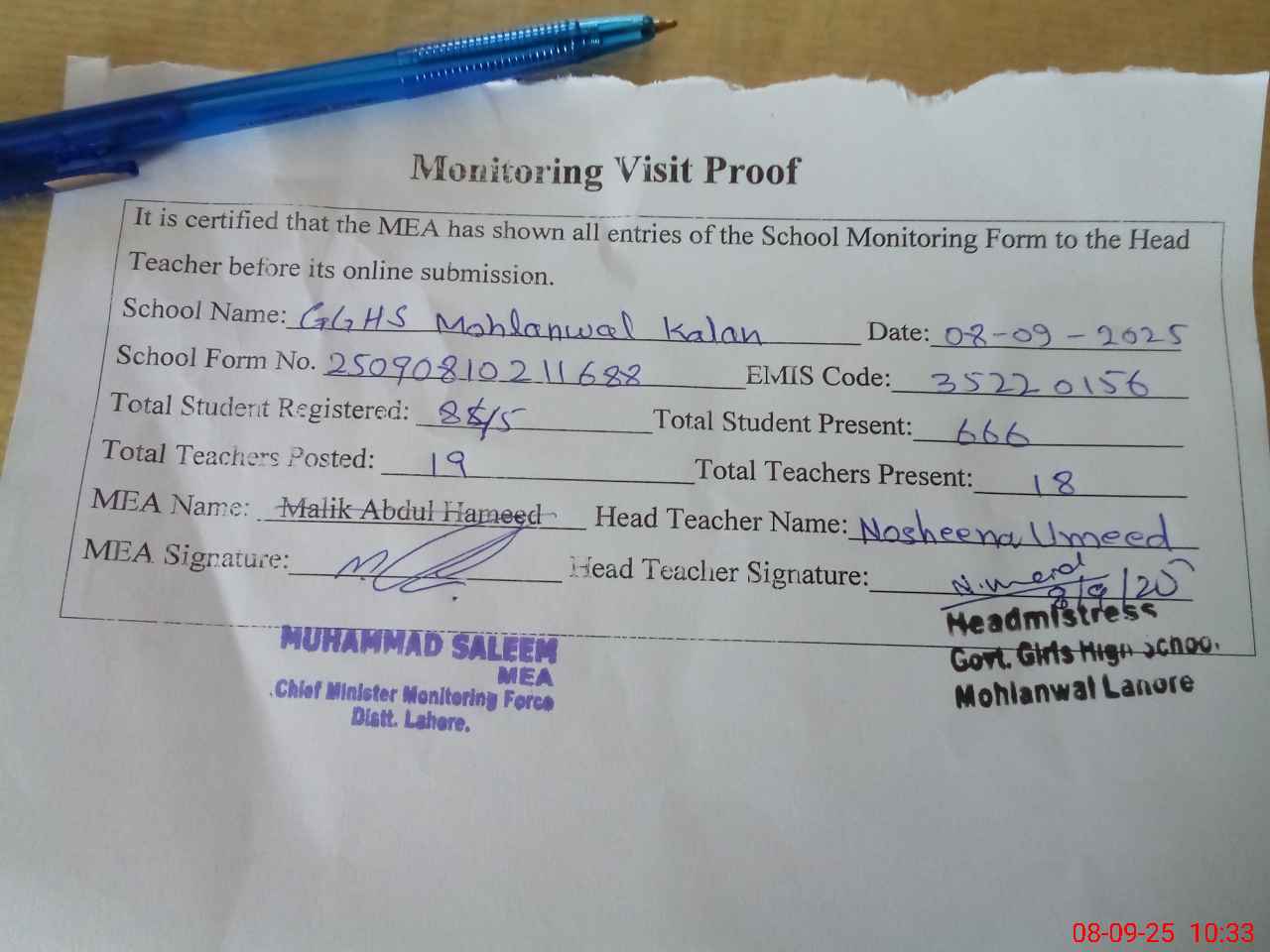 | Remarks (Use Separate Page if Required): Last school head retired on 31st August 2025 but her name is still exists in PMIU monthly monitoring application teaching staff list of said school One SST IT teacher names Naheed Akhtar is present in the school on temporary duty for 89 days One SG name Mr M Awais is present in the school on temporary duty for 89 days Due to shortage of classrooms class three students accommodated in ECE class room with ECE students Swings available in ECE room are not useable due to less space About five class rooms and three Science teachers are required as mentioned by head teacher It is a high school not having any science and computer lab Some windows required repair work Complete school building required distemper and some repairs work Height of boundary wall of the school is less than five feet from outside however it is normal from inside About four students names are required to be deleted from SIS 35220156 | |||||