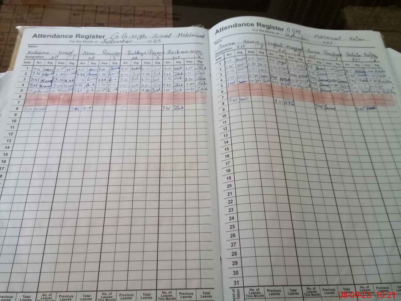 | Total no. of Classrooms: 15 No. of Classrooms Used for Teaching: 13 No. of Classrooms Storing Old Furniture, FTBs, etc: 0Comments if Any: Last school head retired on 31st August 2025 but her name is still exists in PMIU monthly monitoring application teaching staff list of said school One SST IT teacher names Naheed Akhtar is present in the school on temporary duty for 89 days One SG name |