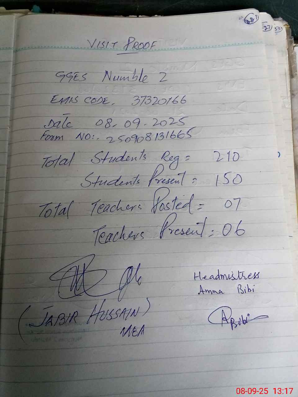 | Attendance Register | Head Teacher | MEA with School | Visit Proof |