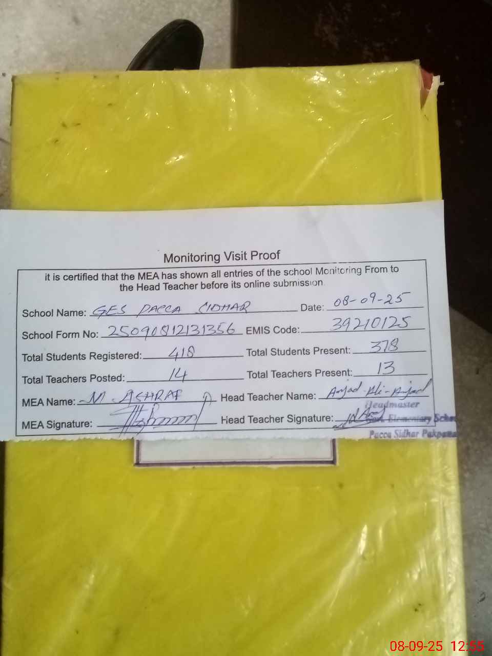 | Attendance Register | Head Teacher | MEA with School | Visit Proof |