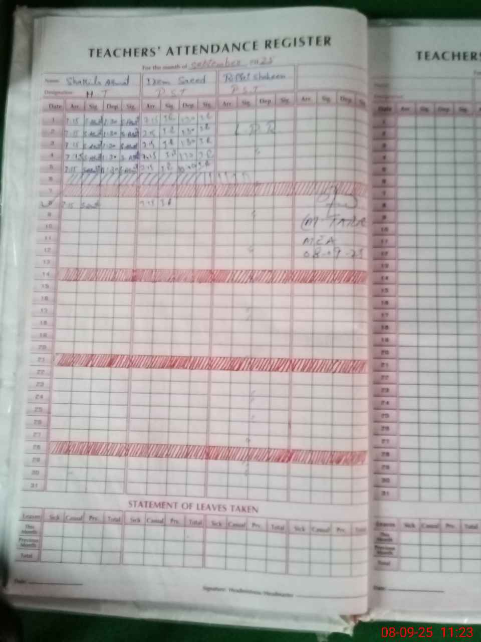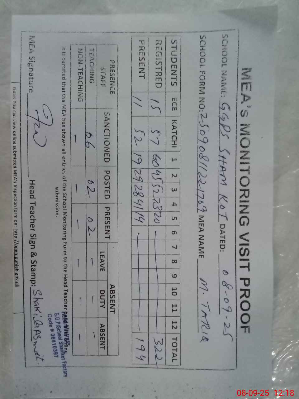 | Attendance Register | Head Teacher | MEA with School | Visit Proof |