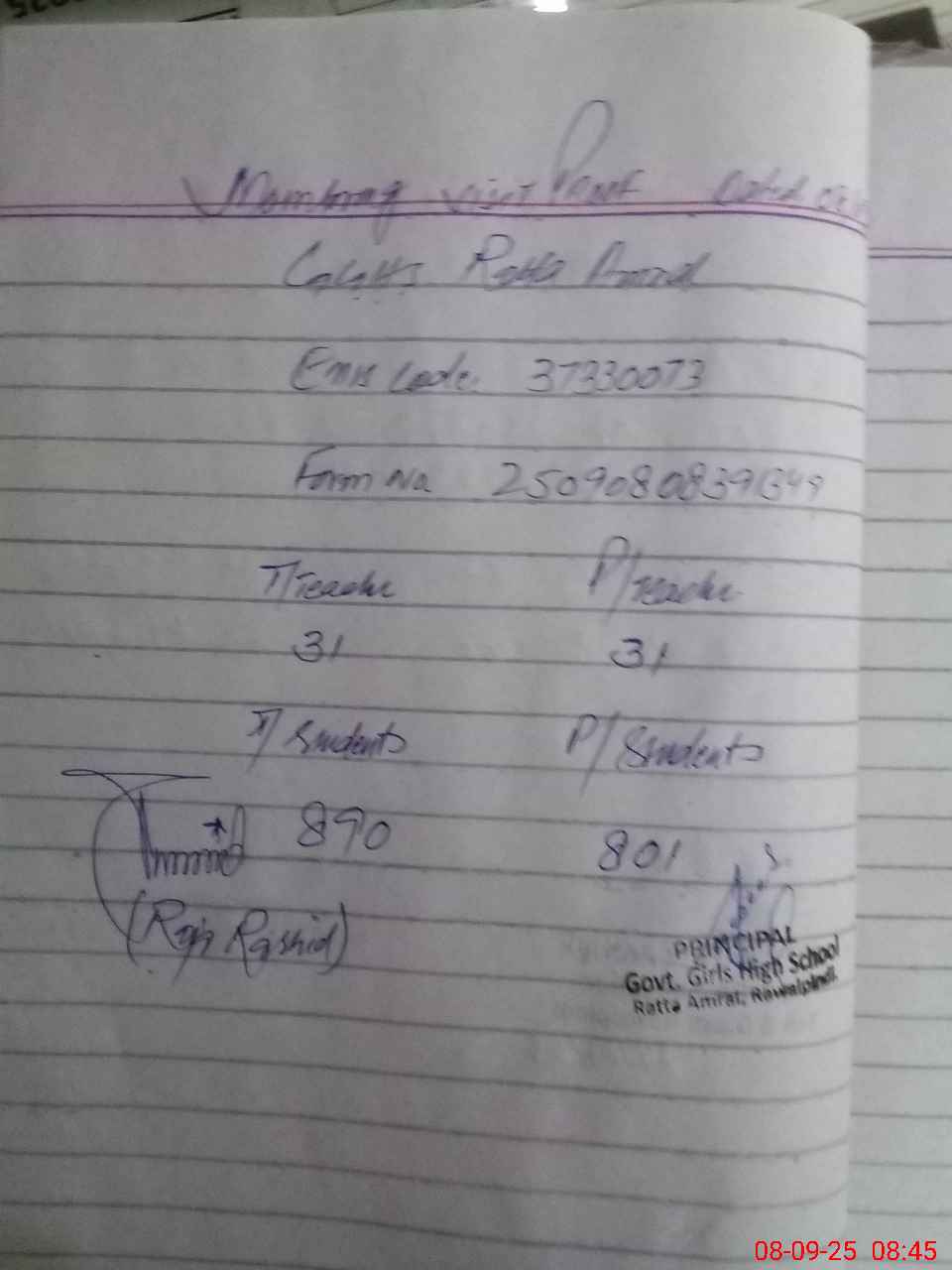 | Name: Na**** Ra**** Designation: (School Headmaster's/Headmistress's) Principal Phone/Cell Number: 03**** |