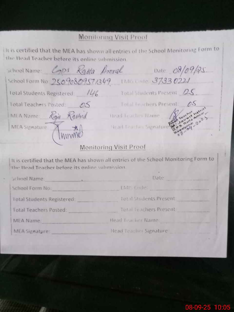 | Monitoring Date: 08-09-2025 | Start Time: 08-09-2025 09:39 AM | End Time: 08-09-2025 10:05 AM | Name of MEA: Ra**** Ra**** Al**** | |