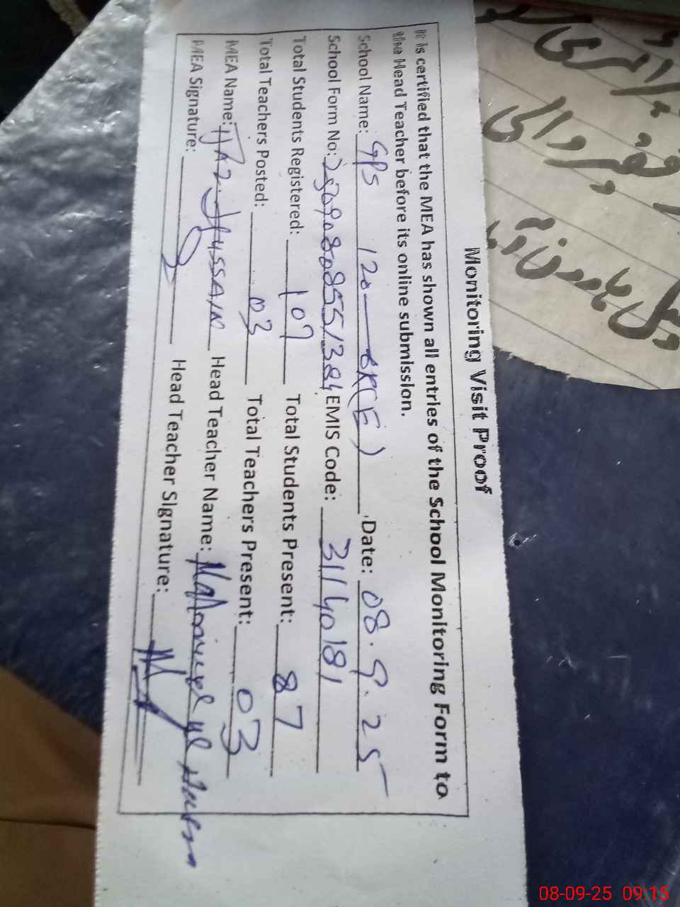 | Attendance Register | Head Teacher | MEA with School | Visit Proof |